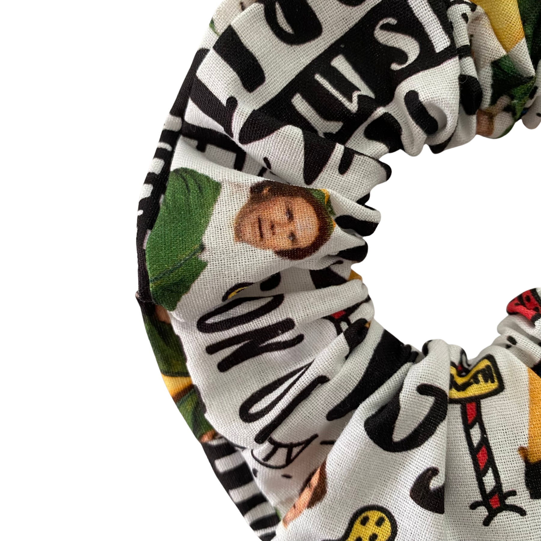 Our Buddy Elf Christmas Holiday Quotes Scrunchie is handmade from cotton woven fabric with playful images and quotes from Elf on a white background. Finished with strong braided elastic, it provides a secure yet gentle hold, perfect for everyday wear. Available in three sizes, this scrunchie is a holiday favourite and a cheerful way to add a touch of Christmas spirit to your style.