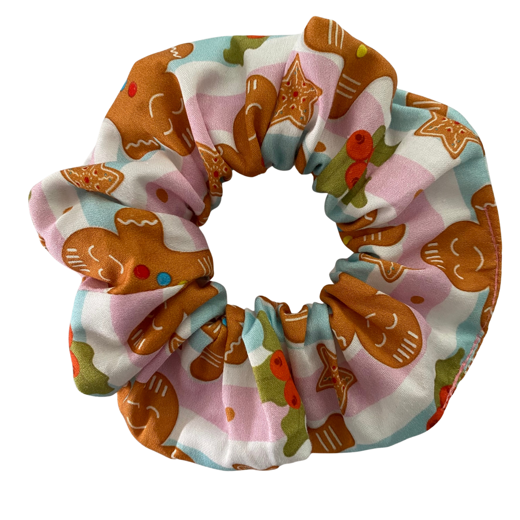Our Gingerbread Stripe Sateen Scrunchie is handmade from cotton sateen fabric and features a festive gingerbread man on a pastel striped background. Finished with high-quality braided elastic, it offers a comfortable and secure hold. Available in three sizes, it’s the perfect fun and festive accessory for the holiday season.