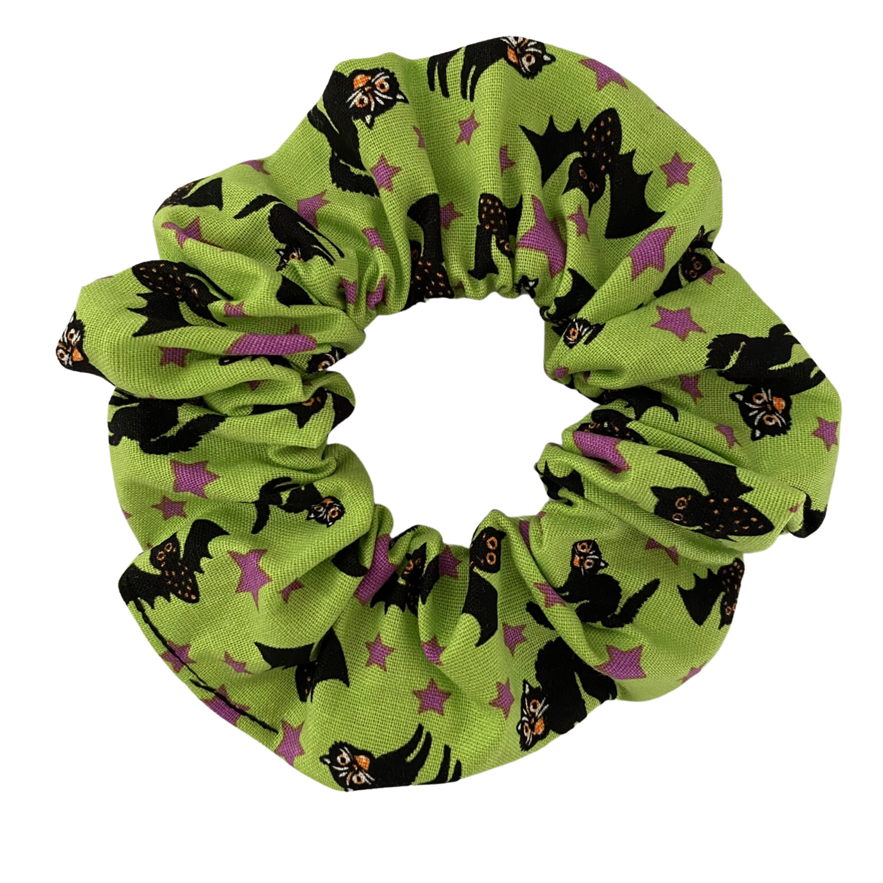 Our Halloween Black Cats & Bats Scrunchie is handmade from soft cotton woven fabric, features durable braided elastic, and comes in four sizes—perfect for adding a spooky-cute twist to your Halloween look!
