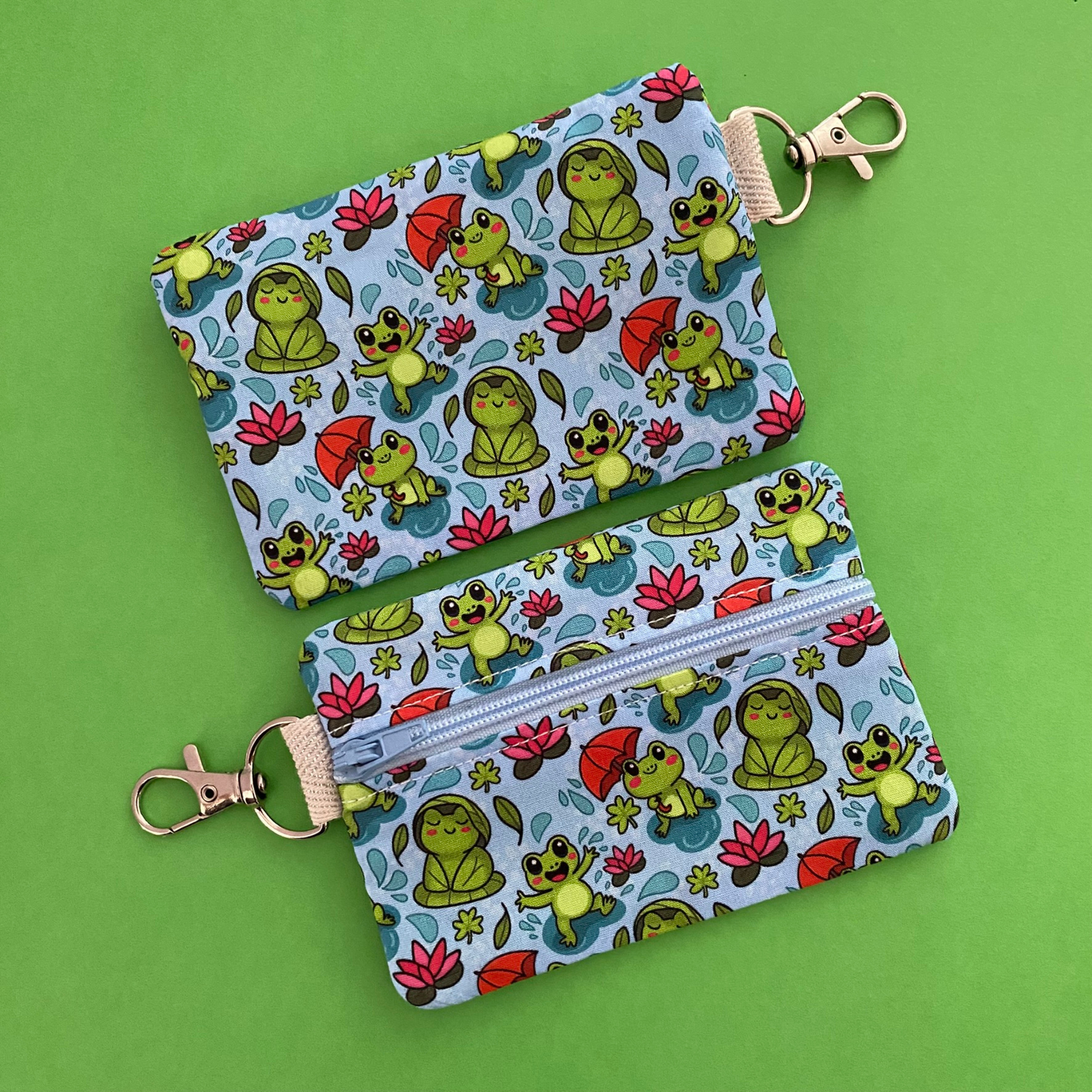 Handmade from premium cotton woven fabric, our Rainy Frogs Mini Pouch is a charming coin purse featuring cute frogs in the rain holding umbrellas and sitting on lily pads set against a crisp blue background. Complemented by a lime green lining and a quality light blue zipper, it is reinforced with interfacing for extra stability.