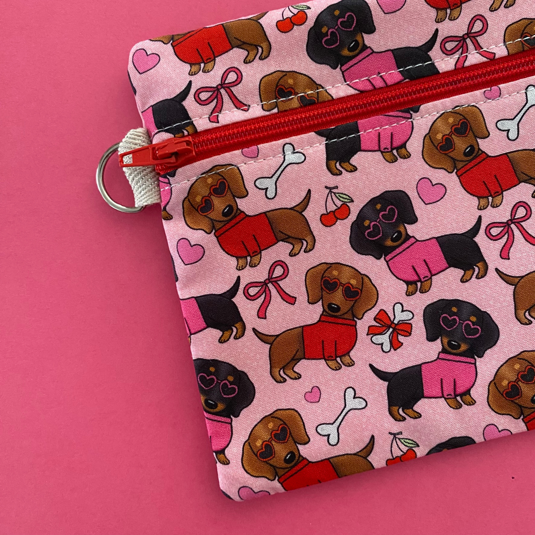 Keep your essentials organised with our fully lined Sausage Dog Squad zipper pouch, featuring adorable brown and black sausage dogs in jumpers and sunglasses on a cheerful pink background. Complemented by a vibrant pink lining and a quality red zipper, this pouch is reinforced with double interfacing for extra stability and a premium feel. Each piece includes a sewn-in tag and a sturdy D-ring, perfect for attaching your favourite keyring or tassel.