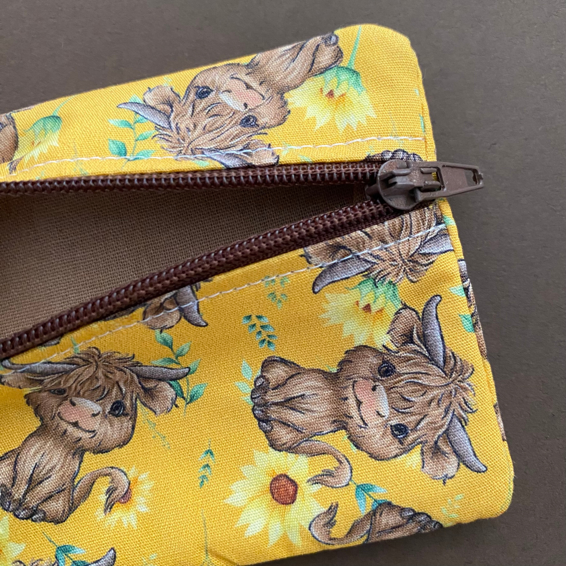 Handmade from premium cotton woven fabric, our Highland Cow Mini Pouch coin purse features adorable Highland Cows and sunflowers on a cheerful yellow background. Complemented by a light brown lining, it’s finished with a quality brown zipper and reinforced with interfacing for extra stability.