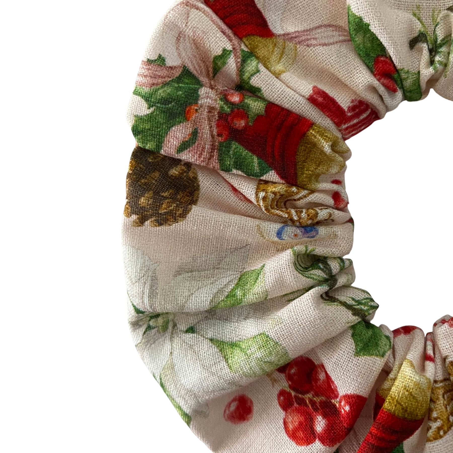 Our Vintage Christmas Mix Scrunchie is handmade from cotton woven fabric with vintage festive images on a cream background. Designed with strong braided elastic, it provides a secure yet gentle hold, perfect for everyday wear. Available in three sizes, this scrunchie is a holiday favourite and a cheerful way to add a touch of Christmas spirit to your style.
